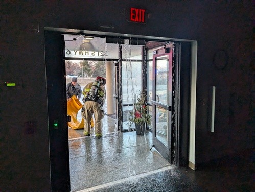 Yes - we had a pipe burst. Above the entrance... and flooding through the narthex, down into the basement. The fire crew (it was the fire suppressant water pipes) was GREAT! Truly. In the picture you can see they are bringing in a tarp to re-direct water OUT the entrance - thus a river through the parking lot. Do be careful the next few days as there is a river of ice still.