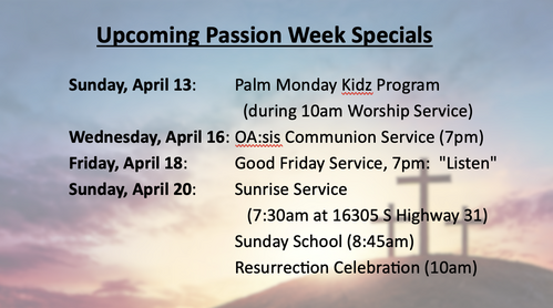 Please register soon so we can ensure we have books. Palm Monday Kidz - The annual program with our Sunday school kids presenting will be on Palm Sunday, April 13 during the worship service. Parents - your kids likely have practice sheets... please help them as you can.